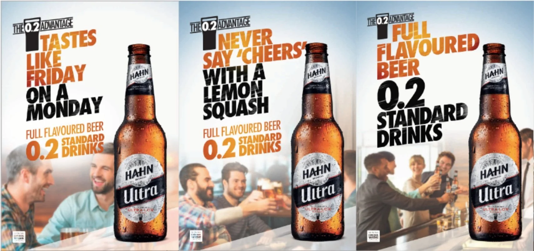 While lite beers tried to compete on taste we based our campaign on the benefit of THE 0.2 ADVANTAGE, it turned our weak alcohol content of just 0.9% or just 0.2 standard drinks into our greatest strength and wrote unapologetic headlines like "Tastes like a Friday on a Monday" and “Never say cheers with a lemon squash” to position the new Hahn Ultra beer as a game-changer for the social occasion - not a compromise.