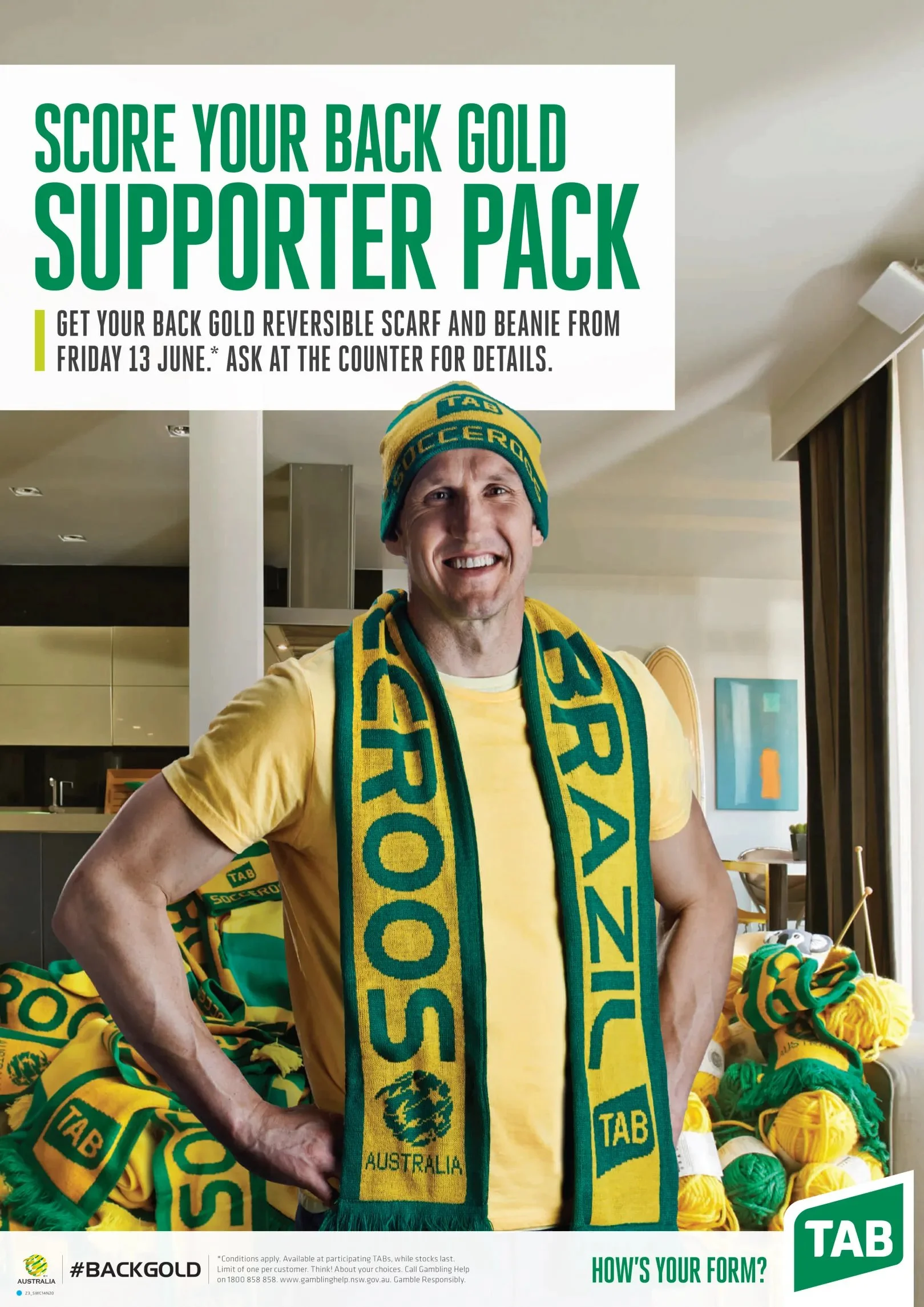 So we came up with supporters’ gear that they’d received when they backed Gold, the colour that kept them on the winning side with a second team to barrack for – the hosts Brazil – all the way ’til the very end of the competition. Reversible Supporter’s gear with two teams who shared Gold & Green. Our campaign ran across TV, print, POS and Online and reaffirmed TAB once again as Australia’s largest betting company.